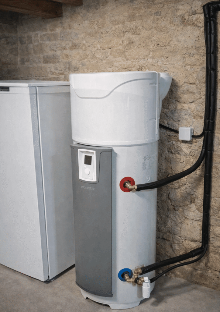 Côté usage, le ballon thermodynamique monobloc fonctionne comme une solution compacte et autonome : une pompe à chaleur intégrée au ballon capture des calories de l’air pour la production d’eau chaude sanitaire. Il se pose facilement dans un local ventilé, pertinent en logement avec espace technique disponible.